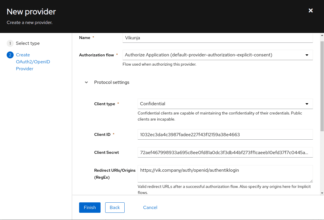 • Set a Strict redirect URI to https://vik.company/auth/openid/authentiklogin.